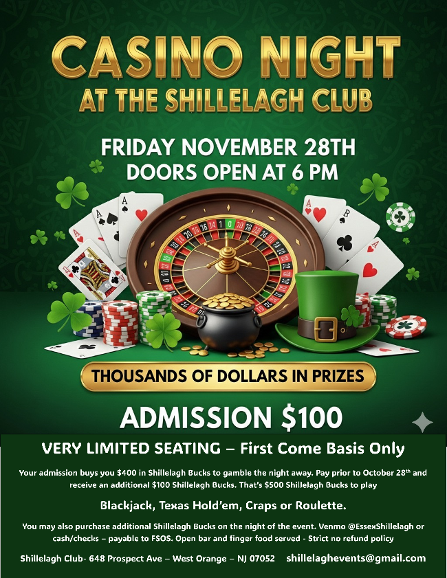 • Tickets: $100 pp, Limited to 120 — secure yours with Venmo (@ShillelaghClub) or cash/check payable to FSOS