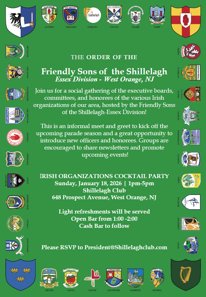 Join us for a social gathering of the executive boards, committees, and honorees of the various Irish organizations of our area, hosted by the Friendly Sons of the Shillelagh-Essex Division!